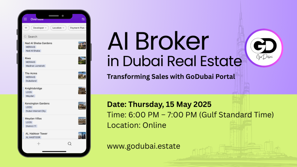 Join us on Thursday, 15 May 2025, from 6:00 PM to 7:00 PM (Gulf Standard Time) for a high-impact virtual event where we reveal how smart brokers and serious investors are closing deals faster using GoDubai Portal’s cutting-edge tools—featuring our powerful AI Broker.
