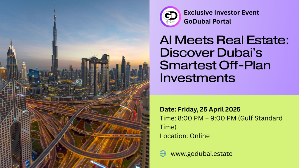 Join us on Friday, 25 April 2025, from 8:00 PM to 9:00 PM (GST) for a power-packed virtual event where we unveil the smartest way to invest in off-plan projects—powered by our advanced AI Broker on the GoDubai Portal.